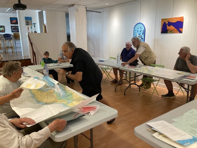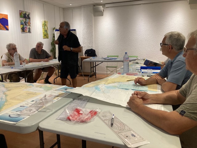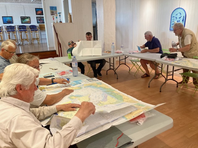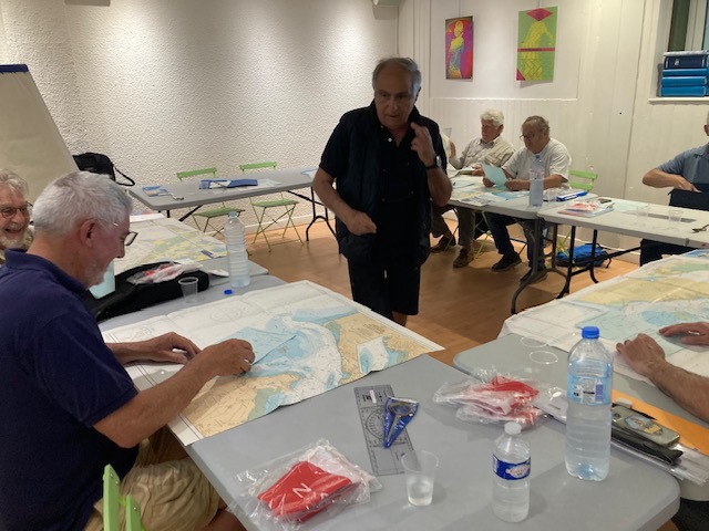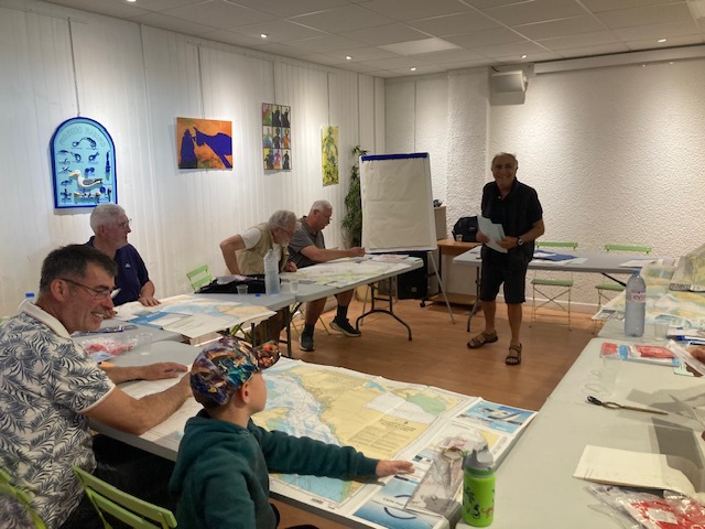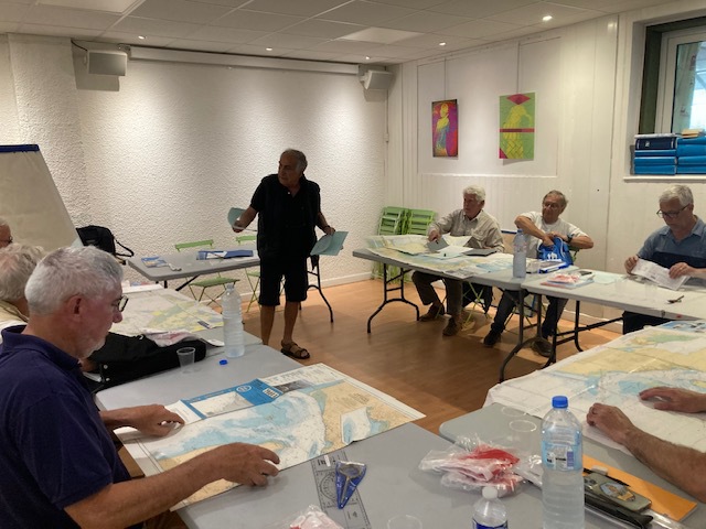 Une dizaine de participants de tous âges lors de la deuxième séance de lecture de carte marine, heureux semble-t-il de se retrouver sur les bancs de l’école !